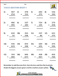 Math Worksheets 3 Digit Addition. In third grade, children practice mental additions with two-digit numbers and certain easy type of additions with three-digitn umbers. Three Digit Addition Cube Worksheet - Twenty-five problems for you to walk through.