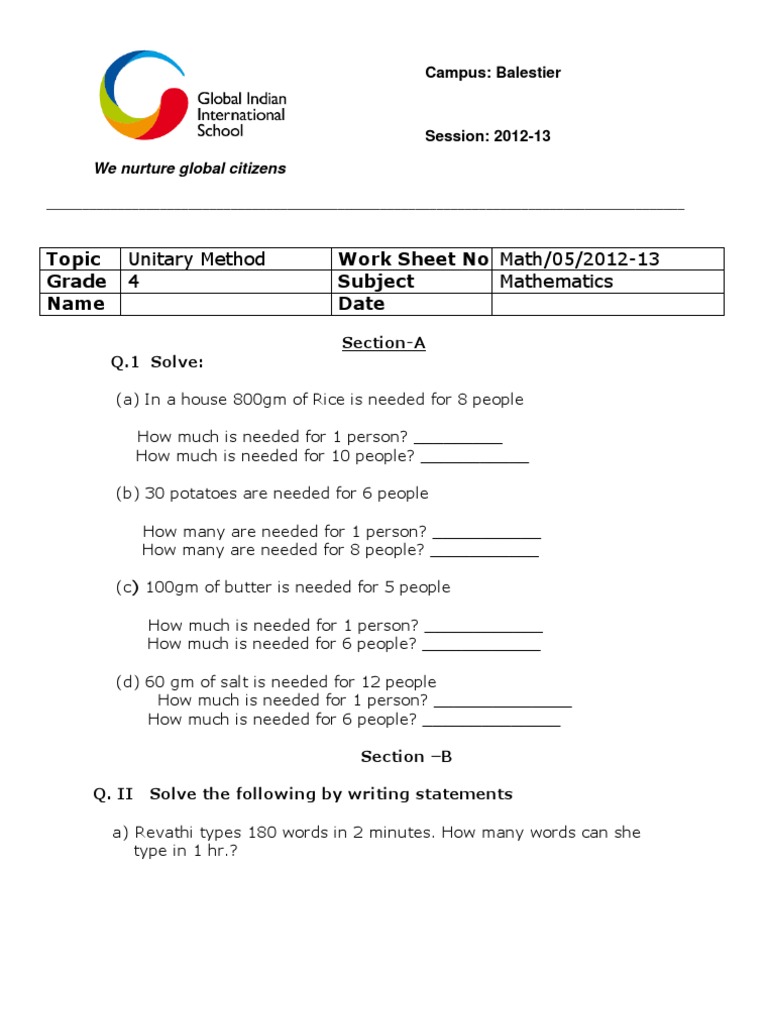 Math Worksheets Unitary Method. Our PDF math worksheets are available on a broad range of topics including number sense, arithmetic, pre-algebra, geometry, measurement, money concepts and much more. Unitary Method is useful to solve problems of ratio, proportion, algebra, etc.